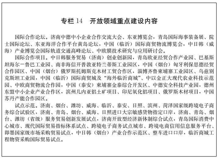 構(gòu)建開放型經(jīng)濟(jì)新體制。充分借鑒自由貿(mào)易試驗區(qū)改革試點經(jīng)驗,在濟(jì)南、青島、煙臺市,依托國家級新區(qū)、國家級經(jīng)濟(jì)技術(shù)開發(fā)區(qū)、國家級高新技術(shù)開發(fā)區(qū)、海關(guān)特殊監(jiān)管區(qū),以及濟(jì)南新舊動能轉(zhuǎn)換先行區(qū),加快體制機(jī)制創(chuàng)新。支持青島積極創(chuàng)造條件,探索建設(shè)自由貿(mào)易港。支持濟(jì)南開展構(gòu)建開放型經(jīng)濟(jì)新體制綜合試點。推動濟(jì)寧、日照、淄博、青島空港、即墨等綜合保稅區(qū)盡早獲批,支持其他符合條件的市申建海關(guān)特殊監(jiān)管區(qū)域,推進(jìn)現(xiàn)有海關(guān)特殊監(jiān)管區(qū)域延伸服務(wù)功能。推進(jìn)威海中韓自貿(mào)區(qū)地方經(jīng)濟(jì)合作示范區(qū)、中韓(煙臺)產(chǎn)業(yè)園建設(shè)。全面實行準(zhǔn)入前國民待遇加負(fù)面清單管理制度,加強(qiáng)外商投資企業(yè)事中事后監(jiān)管,探索“無感知”和“低感知”監(jiān)管方式。推行“服務(wù)大使”制度,加強(qiáng)重點外資企業(yè)點對點直通包辦服務(wù)。擴(kuò)大服務(wù)業(yè)對外開放,根據(jù)國家部署,有序放開育幼養(yǎng)老、建筑設(shè)計、會計審計、商貿(mào)物流、電子商務(wù)等服務(wù)業(yè)領(lǐng)域準(zhǔn)入限制。開展跨境電子商務(wù)人民幣結(jié)算、跨境資產(chǎn)轉(zhuǎn)讓政策創(chuàng)新和融資租賃試點。