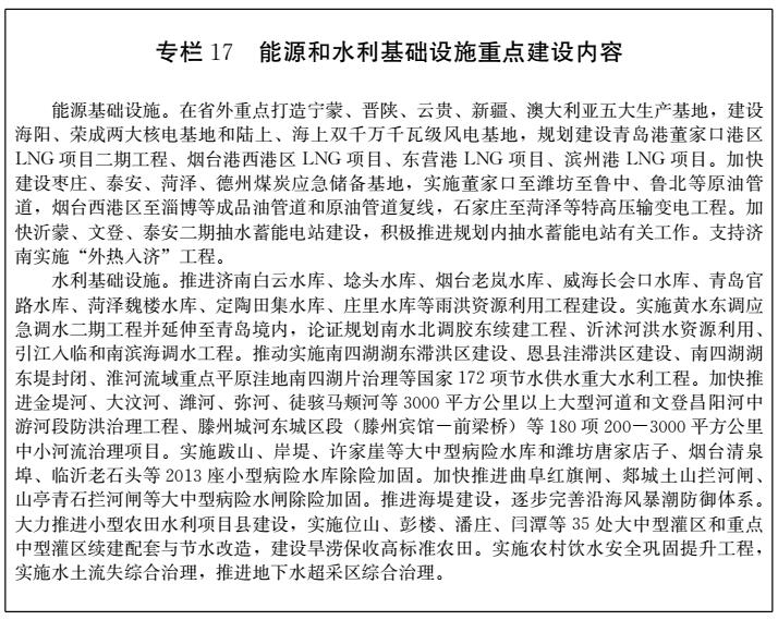水利基礎(chǔ)設(shè)施。突出水資源的剛性約束,以節(jié)水、供水重大工程建設(shè)為重點,構(gòu)筑水安全保障體系。論證規(guī)劃峽山水利膠東調(diào)水水源等工程,建設(shè)一批河道攔蓄工程和抗旱應(yīng)急水源工程。實施金堤河等河道重點河段治理,推進(jìn)病險水庫水閘除險加固,疏浚治理河湖水系,加強(qiáng)沿海7市海堤工程建設(shè),推進(jìn)黃河口治理,實施地下水超采區(qū)綜合治理工程。加強(qiáng)大中型灌區(qū)續(xù)建配套節(jié)水改造,加快小型農(nóng)田水利項目縣建設(shè)。