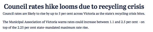據(jù)《The Age》報(bào)道,維州垃圾回收危機(jī)將造成市政費(fèi)上漲高達(dá)5%。市政費(fèi)是市政廳對管轄區(qū)內(nèi)所有業(yè)主(包括居民和企業(yè))征收的費(fèi)用,其中有一部分會(huì)用于當(dāng)?shù)氐睦幚怼?/p>