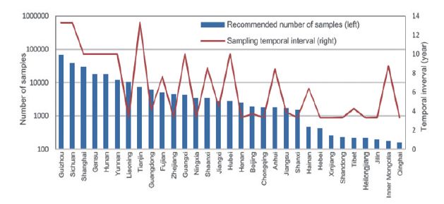 土壤重金屬污染是動(dòng)態(tài)變化的,重金屬濃度隨污染源的輸入和植物吸收、流水等作用輸出的變化而變化。如何在時(shí)間和空間上監(jiān)測(cè)土壤重金屬污染狀況的變化特征亦是一個(gè)不可忽視的重要問(wèn)題。通過(guò)對(duì)前一次樣點(diǎn)的定位,再次采集、分析,比較同一樣點(diǎn)前后兩次土壤重金屬濃度的變化,是最為有效的監(jiān)測(cè)土壤重金屬變化的方式。但因土壤的空間異質(zhì)性、采樣方法和統(tǒng)計(jì)誤差等影響,土壤重金屬濃度變異度的數(shù)值大小可以通過(guò)再次采樣而被檢測(cè)是需要考慮的問(wèn)題。同時(shí),多次大量的樣品采集雖然能夠提高監(jiān)測(cè)精度,但成本也相應(yīng)升高,在操作上不現(xiàn)實(shí)。監(jiān)測(cè)精度和成本的平衡,監(jiān)測(cè)區(qū)域樣品數(shù)量和監(jiān)測(cè)時(shí)間間隔的確定是至關(guān)重要的問(wèn)題。中國(guó)地質(zhì)大學(xué)Xia等在全國(guó)土壤調(diào)查的基礎(chǔ)上,以主要行政區(qū)域和主要重金屬污染元素為對(duì)象,研究土壤重金屬污染變化監(jiān)測(cè)的樣品采集數(shù)量和采集時(shí)間間隔,發(fā)現(xiàn)由于研究區(qū)域大的空間變異,很難確定土壤重金屬濃度最小可監(jiān)測(cè)的變異;根據(jù)成本、可實(shí)踐性和檢測(cè)的精度,考慮重金屬元素的變異性和設(shè)定變異程度,針對(duì)不同區(qū)域推薦了一系列合適采樣數(shù)量,不同區(qū)域檢測(cè)的時(shí)間間隔為3.3~13.3年(圖1)。該研究為區(qū)域性土壤重金屬污染變化監(jiān)測(cè)提供較好的研究思路和方法。
