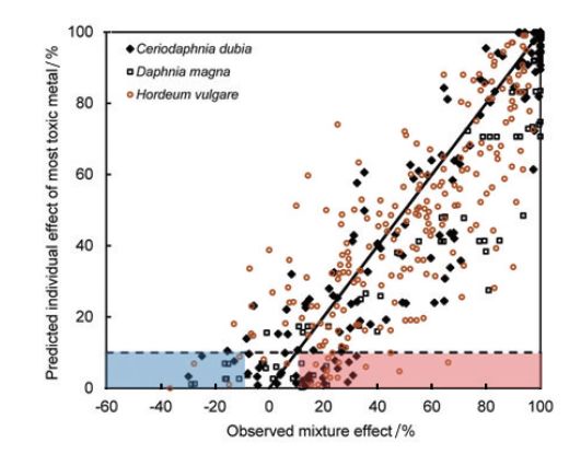土壤重金屬污染對(duì)生態(tài)和人體健康的危害,因污染程度、污染元素種類(lèi)以及暴露途徑的不同而不同。目前相關(guān)的環(huán)境風(fēng)險(xiǎn)評(píng)估和環(huán)境質(zhì)量標(biāo)準(zhǔn)的主要以單一污染物為基礎(chǔ),這與土壤重金屬污染常為多元素的復(fù)合型污染不盡一致。由于金屬間的相互作用,以及金屬與生物體作用可能表現(xiàn)為協(xié)同、拮抗或無(wú)相互作用等,導(dǎo)致多種金屬元素混合比單一元素具有不同的環(huán)境效應(yīng)。在復(fù)合污染生物毒性研究中,常用兩種模型,獨(dú)立作用(independentaction)和濃度加和(concentrationaddition)參考模型,前者認(rèn)為金屬元素毒性作用不同,后者則認(rèn)為具有相似的作用效果;但是兩個(gè)模型均認(rèn)為污染物在目標(biāo)點(diǎn)位上沒(méi)有相互作用,該假設(shè)與實(shí)際情況不盡相符。比利時(shí)根特大學(xué)Nys等通過(guò)設(shè)定多種金屬?gòu)?fù)合,開(kāi)展了30多組大型蚤、模糊網(wǎng)紋蚤和大麥毒性試驗(yàn),檢驗(yàn)在低濃度下獨(dú)立作用和濃度加和參考模型適用性。部分重金屬單獨(dú)存在對(duì)測(cè)試生物影響效應(yīng)在10%以下,而經(jīng)復(fù)合后可產(chǎn)生高達(dá)66%的抑制作用(圖2);整體上獨(dú)立作用參考模型對(duì)混合毒性預(yù)測(cè)精度更高,濃度加和參考模型則更為保守;在風(fēng)險(xiǎn)評(píng)估中更為重要的低劑量水平上,用濃度加和參考模型預(yù)測(cè)的重金屬?gòu)?fù)合對(duì)模糊網(wǎng)紋蚤和大麥毒性比觀測(cè)值高1.4~3.6倍。該研究結(jié)果表明,目前所應(yīng)用的單一重金屬的風(fēng)險(xiǎn)評(píng)價(jià),對(duì)于重金屬?gòu)?fù)合情況可能不夠保守。