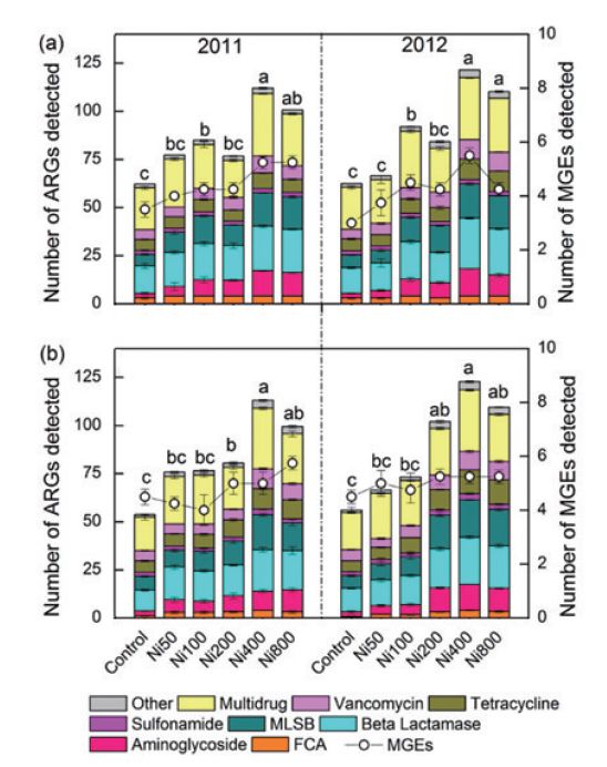 抗生素對(duì)細(xì)菌感染、致病微生物感染類(lèi)疾病的防治具有重要作用,但由此而來(lái)的抗性基因的快速增加和傳播也威脅著人體健康??剐曰虻难芯吭桨l(fā)受到學(xué)者關(guān)注,成為研究熱點(diǎn)。除抗生素選擇產(chǎn)生抗性基因外,環(huán)境中重金屬對(duì)抗生素抗性的選擇和傳播擴(kuò)散具有重要作用。中國(guó)科學(xué)院生態(tài)環(huán)境研究中心Hu等通過(guò)對(duì)Ni長(zhǎng)期污染土壤誘導(dǎo)的抗性基因進(jìn)行研究,發(fā)現(xiàn)在長(zhǎng)期不同程度Ni污染下,共檢測(cè)到149種抗性基因,以多藥和β-內(nèi)酰胺類(lèi)抗生素抗性為主,抗性基因的頻率和豐度隨Ni污染程度的增加而升高(圖3);抗性基因與可移動(dòng)抗性原件具有顯著相關(guān)性,表明Ni污染增加了抗性基因的水平轉(zhuǎn)移,該水平轉(zhuǎn)移與intI1整合子有關(guān)。區(qū)別于以往重金屬的直接毒性風(fēng)險(xiǎn),該研究闡述了重金屬在土壤環(huán)境中的間接風(fēng)險(xiǎn)-增加抗性基因產(chǎn)生和傳播風(fēng)險(xiǎn)。