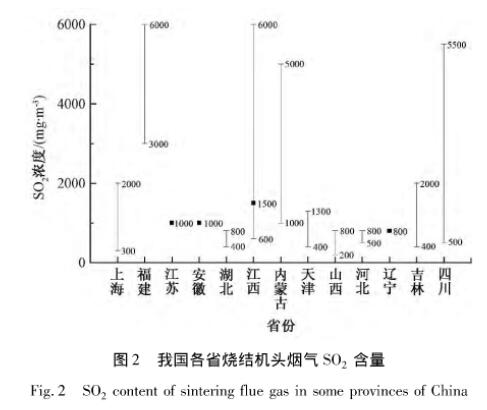 燒結(jié)機(jī)頭煙氣中SO2因燒結(jié)原料的配比、鋪料方式、燒結(jié)工況等因素影響,波動(dòng)很大,不同地區(qū)原料不同,差異明顯。我國(guó)各地區(qū)燒結(jié)機(jī)頭煙氣中SO2含量見圖2。