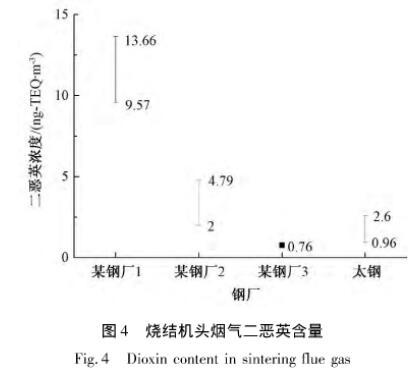 燒結(jié)過程中的二惡英主要由“從頭合成”途徑生成。燒結(jié)原料中含有的Fe、Cu、Cl等元素提供了催化劑和氯源;燃料的不充分燃燒提供了大分子碳源;燒結(jié)過程漏風(fēng)率高,含氧充足,在250~450℃,二惡英的“從頭合成”得以發(fā)生。目前國(guó)內(nèi)關(guān)于燒結(jié)煙氣中二惡英含量的報(bào)道較少,如圖4所示,不同燒結(jié)煙氣的二惡英排放量差別很大,可能跟原料與工況有關(guān)。
