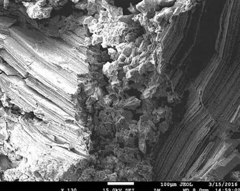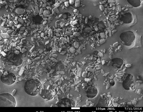 根據(jù)化學分析結果可見,除霧器上的垢物與石膏的組成較為接近,主要成分均為CaS04˙2H20。結合除霧器的工作機理,可以認為除霧器的垢物與石膏的來源均為脫硫漿液所攜帶的固體顆粒物。但是掃描電鏡微觀顯示其晶體形態(tài)完全不同,除霧器垢物是顆粒與片狀晶體的混合物,而脫硫石膏呈現(xiàn)出顆粒狀(或短柱狀)晶體結構。