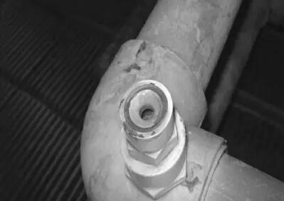 在事故發(fā)生后,檢修人員對該機組沖洗水管道和噴嘴進行了逐個檢查,結果表明50多個噴嘴發(fā)生了堵塞或脫落。原因是噴嘴形式為軸向實心錐,外觀如圖3所示,兩級除霧器下表面沖洗水管上的噴嘴均為噴口向上,除霧器葉片上脫落的軟垢極易進入噴嘴的出口,由于不是連續(xù)沖洗,噴嘴出口堆積的軟垢經(jīng)過一段時間的停留,會變得結實從而造成噴嘴堵塞。