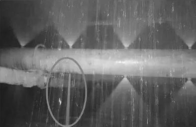 另外當沖洗水含固量較高或存在異物時,也會造成噴嘴堵塞。在后續(xù)運行中,發(fā)生噴嘴堵塞的區(qū)域形成沖洗死角,除霧器葉片無法得到?jīng)_洗,極易結垢。另外還有部分沖洗水噴嘴脫落或沖洗水管斷裂,也會大大降低沖洗效果。如圖4所示,紅圈處的噴嘴脫落,沖洗水成柱狀下流,沖洗面積大大減小,所對應的區(qū)域將無法得到有效沖洗。此類故障在運行中難以發(fā)現(xiàn),需要每次停機時加強檢修,及時將脫落和堵塞的噴嘴進行修復。