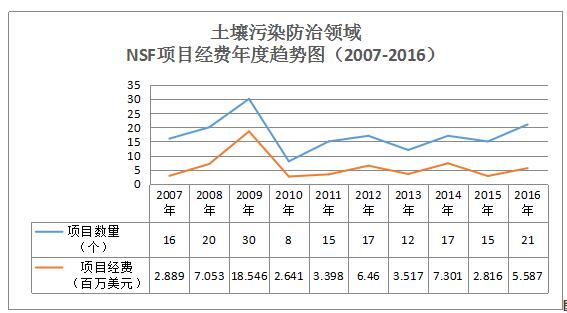 通過項目數(shù)據(jù)分析(見圖12),在土壤污染防治領(lǐng)域,美國國家科學(xué)基金資助經(jīng)費在2007年至2009年呈現(xiàn)了穩(wěn)步遞增的趨勢,2009年項目數(shù)量達到峰值30個。2010年出現(xiàn)拐點,項目數(shù)量下降為8個,2011年又開始回升,之后5年一直較為平穩(wěn),2016年有所增加,達到21個。