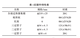 二、三級過熱器的梳形板支架的材質(zhì)為06Cr25Ni20。鍋爐的煙氣流程為:爐膛→冷卻室1→冷卻室2→凝渣管→三級過熱器→二級過熱器→一級過熱器→省煤器。部件特性詳見表1。