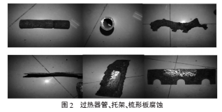 2016年10月鍋爐首次內(nèi)部檢驗時發(fā)現(xiàn)鍋爐三級、二級過熱器管子表面存在大面積腐蝕、氧化現(xiàn)象,梳形板位置的管子外表面存在局部腐蝕凹坑。腐蝕、氧化最嚴(yán)重部位為三級過熱器從下往上數(shù)第1排,其最小剩余壁厚為3.0mm,最大腐蝕凹坑深1.5mm。鍋爐三級、二級過熱器管排的托架、梳形板沿?zé)煔夥较蚋g減薄嚴(yán)重,部分變形、脫落(詳見圖2)。鍋爐使用至2017年4月,腐蝕情況進(jìn)一步加劇。