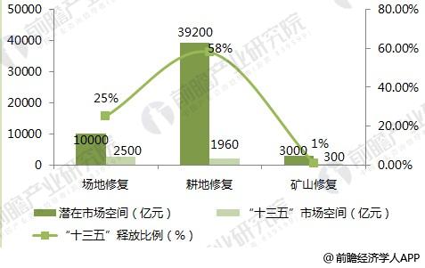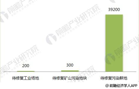 前瞻產(chǎn)業(yè)研究院發(fā)布的《2018-2023年中國生態(tài)修復(fù)行業(yè)市場前瞻與投資戰(zhàn)略規(guī)劃分析報(bào)告》顯示,根據(jù)國家“到2020年現(xiàn)有位于城鎮(zhèn)內(nèi)人口密集區(qū)域的?;飞a(chǎn)企業(yè)全部啟動搬遷改造”的指標(biāo),可以推測我國有待修復(fù)的工業(yè)場地存量200萬畝,根據(jù)招投標(biāo)現(xiàn)狀來看,每塊地修復(fù)成本從百萬至千萬甚至上億不等,保守估計(jì)以每畝地20-50萬元價(jià)格來估算,則場地修復(fù)市場空間將達(dá)到1萬億元;我國的待修復(fù)礦山污染地塊在300萬畝左右,保守估計(jì)以每畝地5-10萬元左右價(jià)格垃圾進(jìn)行估算,則礦山修復(fù)市場空間將達(dá)到3000億元左右;待修復(fù)的污染耕地面積約為3.92億畝,每畝耕地修復(fù)價(jià)格以1萬元為計(jì)算,則污染耕地修復(fù)市場空間為3.92萬億??傆?jì)來看,這三類待修復(fù)土壤潛在市場空間達(dá)5.22萬億元。