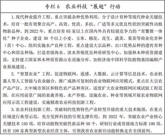 (一)提升農(nóng)業(yè)科技創(chuàng)新能力。積極爭取國家級(jí)涉農(nóng)科研機(jī)構(gòu)在山東布局分支機(jī)構(gòu),加快濰坊北京大學(xué)現(xiàn)代農(nóng)業(yè)研究院建設(shè)。強(qiáng)化全省農(nóng)業(yè)高校、科研院所、農(nóng)產(chǎn)品加工大企業(yè)研發(fā)中心等各類農(nóng)業(yè)科技資源整合和集成,搭建農(nóng)科教創(chuàng)新平臺(tái),建設(shè)一批省級(jí)以上農(nóng)業(yè)重點(diǎn)實(shí)驗(yàn)室和技術(shù)創(chuàng)新中心,造就一批具有較強(qiáng)國際競爭力的創(chuàng)新型領(lǐng)軍企業(yè),全面提升農(nóng)業(yè)科技創(chuàng)新能力和核心競爭力。多管齊下引進(jìn)對(duì)我省現(xiàn)代農(nóng)業(yè)產(chǎn)業(yè)發(fā)展有重大影響的創(chuàng)新科研團(tuán)隊(duì)和海內(nèi)外高層次農(nóng)業(yè)科技人才。通過政策扶持、項(xiàng)目匹配、資金資助等方式,深入實(shí)施農(nóng)業(yè)科研杰出人才計(jì)劃和杰出青年農(nóng)業(yè)科學(xué)家項(xiàng)目,培養(yǎng)一批科技領(lǐng)軍人才和高水平創(chuàng)新創(chuàng)業(yè)團(tuán)隊(duì)。完善首席專家、農(nóng)業(yè)技術(shù)推廣人員和新型經(jīng)營主體的聯(lián)動(dòng)機(jī)制,探索建立“創(chuàng)新團(tuán)隊(duì)+基層農(nóng)技推廣體系+新型職業(yè)農(nóng)民培育”的新型農(nóng)業(yè)科技服務(wù)模式。扎實(shí)推進(jìn)農(nóng)業(yè)科技園區(qū)體系建設(shè),提升綜合創(chuàng)新能力和服務(wù)水平。將黃河三角洲農(nóng)業(yè)高新技術(shù)產(chǎn)業(yè)示范區(qū)建成具有全國影響力的農(nóng)業(yè)科技園區(qū),在部分領(lǐng)域形成世界領(lǐng)先的高科技產(chǎn)業(yè)。到2022年,力爭全省農(nóng)業(yè)高新技術(shù)企業(yè)達(dá)到1000家左右,培育一批產(chǎn)業(yè)規(guī)模超10億元的優(yōu)勢產(chǎn)業(yè),形成年銷售收入超100億元的特色優(yōu)勢產(chǎn)業(yè)集群,農(nóng)業(yè)科技進(jìn)步貢獻(xiàn)率達(dá)到66%左右。