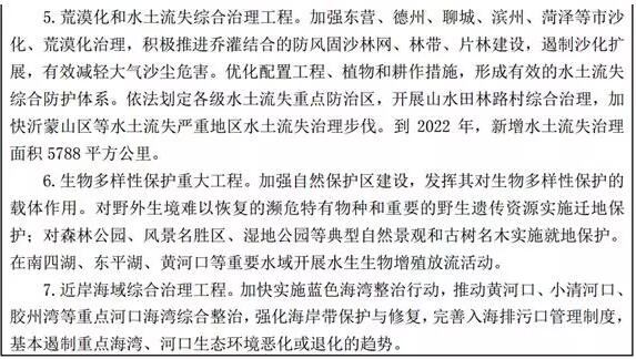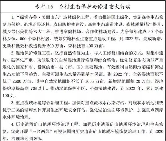 (二)實(shí)施生態(tài)修復(fù)重大工程。實(shí)施濕地修復(fù)工程,對(duì)集中連片、破碎化嚴(yán)重、功能退化的自然濕地進(jìn)行修復(fù)和綜合整治,有效遏制自然濕地萎縮和河湖生態(tài)功能下降趨勢。開展沙化荒漠化治理,以東營、德州、聊城、濱州、菏澤五市為重點(diǎn),積極推進(jìn)喬灌結(jié)合的防風(fēng)固沙林網(wǎng)、林帶、片林建設(shè)。推進(jìn)荒山、荒溝、荒灘整治修復(fù)。積極推進(jìn)泰山山水林田湖生態(tài)修復(fù)國家試點(diǎn)工程。支持長島海洋生態(tài)保護(hù)和持續(xù)發(fā)展。支持資源型城市開展生態(tài)修復(fù)工作,實(shí)施礦山環(huán)境治理恢復(fù),持續(xù)推進(jìn)采煤塌陷地治理。強(qiáng)化農(nóng)業(yè)防災(zāi)減災(zāi)能力建設(shè),提高抵御洪澇災(zāi)害、氣象災(zāi)害等應(yīng)急處置水平。