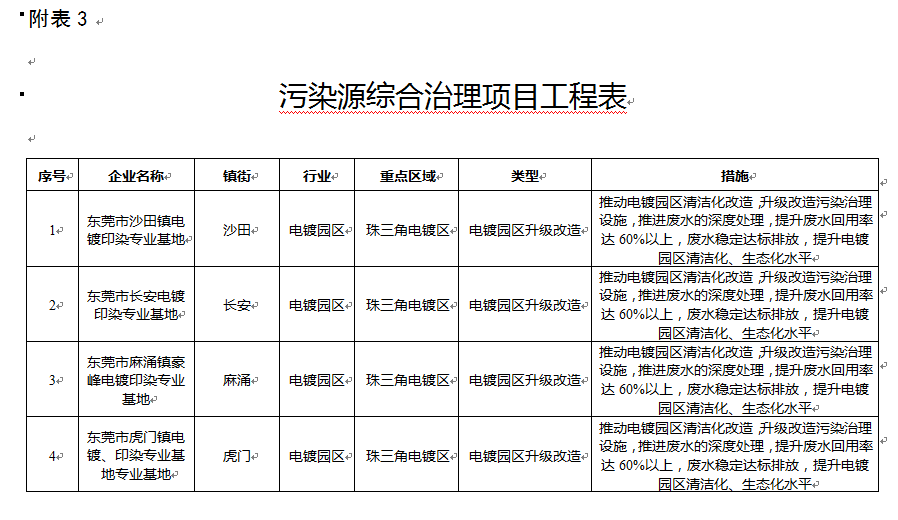 推動(dòng)麻涌鎮(zhèn)、虎門(mén)鎮(zhèn)、長(zhǎng)安鎮(zhèn)、沙田鎮(zhèn)四大涉重金屬工業(yè)園區(qū)清潔、規(guī)范發(fā)展。強(qiáng)化涉重金屬工業(yè)園區(qū)的重金屬污染物排放及周邊環(huán)境中的重金屬監(jiān)測(cè),加強(qiáng)環(huán)境風(fēng)險(xiǎn)隱患排查,向社會(huì)公開(kāi)涉重金屬企業(yè)生產(chǎn)排放、環(huán)境管理和環(huán)境質(zhì)量等信息。2020年前,通過(guò)虎門(mén)鎮(zhèn)電鍍、印染專業(yè)專業(yè)園區(qū)(基地)南柵污水處理廠升級(jí)改造項(xiàng)目、麻涌鎮(zhèn)豪豐電鍍、印染專業(yè)基地電鍍廢水處理廠一期重金屬?gòu)U水深度處理工程、長(zhǎng)安環(huán)保專業(yè)專業(yè)園區(qū)(基地)A區(qū)廢水站改造工程、長(zhǎng)安環(huán)保專業(yè)園區(qū)(基地)B區(qū)廢水站改造工程、麻涌環(huán)保專業(yè)專業(yè)園區(qū)(基地)污水處理二期工程、虎門(mén)鎮(zhèn)電鍍、印染專業(yè)園區(qū)(基地)路東片區(qū)廢水廠升級(jí)改造項(xiàng)目等一系列項(xiàng)目的實(shí)施,確實(shí)加強(qiáng)東莞市重金屬污染治理能力。
