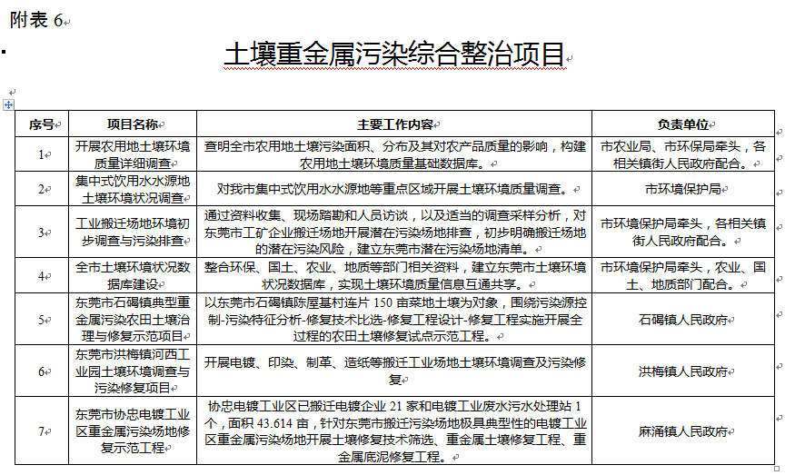 開(kāi)展東莞市土壤污染調(diào)查、搬遷工業(yè)廢棄地重金屬污染修復(fù)技術(shù)集成與工程示范、典型農(nóng)田重金屬污染綜合防治技術(shù)工程示范等項(xiàng)目。開(kāi)展涉重金屬企業(yè)污染防治技術(shù)示范項(xiàng)目16項(xiàng),具體名單見(jiàn)附表5。土壤重金屬污染綜合整治項(xiàng)目7項(xiàng),具體見(jiàn)附表6。