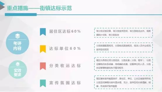 根據(jù)《上海市生活垃圾分類達標(biāo)、示范街道(鎮(zhèn)、鄉(xiāng))考評辦法(試行)》,要成為生活垃圾分類達標(biāo)街鎮(zhèn),其轄區(qū)內(nèi)60%的居住區(qū)和單位先要達標(biāo),轄區(qū)內(nèi)各類垃圾的分類投放、收集(分揀、暫存)、運輸物流體系明確,還要建立垃圾分類領(lǐng)導(dǎo)和協(xié)調(diào)機制,落實居住區(qū)垃圾分類居委、物業(yè)、業(yè)主、第三方的責(zé)任人和所負責(zé)任。成為生活垃圾分類示范街鎮(zhèn)的門檻更高,轄區(qū)內(nèi)80%的居住區(qū)和單位生活垃圾分類實效要達標(biāo)。