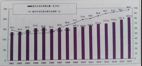 從1979年開始,隨著我國城市化的進(jìn)程,到2016年,我國城市化垃圾已經(jīng)到達(dá)兩億噸??梢钥吹?,我國城市垃圾的無害化處理在2016年已經(jīng)接近100%,可以說我國城市垃圾的無害化處理取得的成績還是非常顯著的。