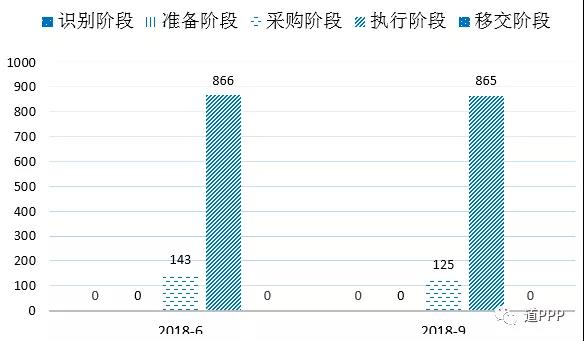 三季度管理庫(kù)環(huán)比新增落地項(xiàng)目421個(gè)、投資額3,135億元,落地率環(huán)比上升2.0個(gè)百分點(diǎn)。管理庫(kù)累計(jì)落地項(xiàng)目總數(shù)4,089個(gè)、投資額6.3萬(wàn)億元,落地率49.3%,比年初上升11.1個(gè)百分點(diǎn),覆蓋除西藏以外的30個(gè)?。ㄗ灾螀^(qū)、直轄市)及新疆兵團(tuán)和19個(gè)領(lǐng)域。管理庫(kù)目前無(wú)移交階段項(xiàng)目。2018年二季度、三季度各階段項(xiàng)目數(shù)如圖1-5-1。