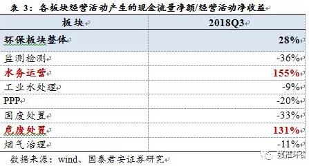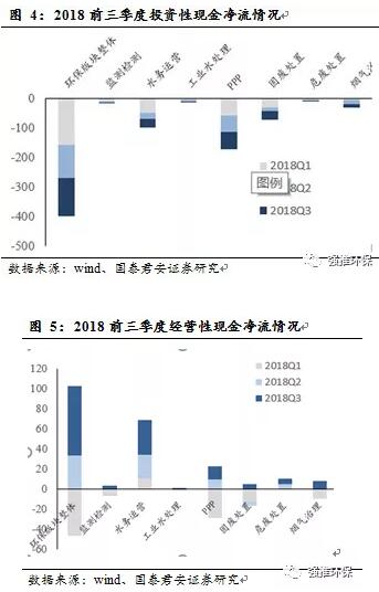 經(jīng)營現(xiàn)金流凈額方面:2018前三季度,環(huán)保行業(yè)整體凈額為55.9億元,受益于水務(wù)運營與危廢處置板塊,現(xiàn)金流超前于收入確認的行業(yè)屬性,其他板塊,現(xiàn)金流與收入的匹配性仍有待提高。