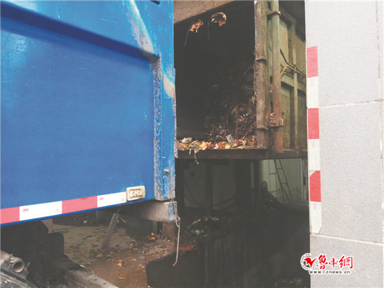 在垃圾轉(zhuǎn)運(yùn)站,壓縮后的垃圾進(jìn)入轉(zhuǎn)運(yùn)車(chē)中。