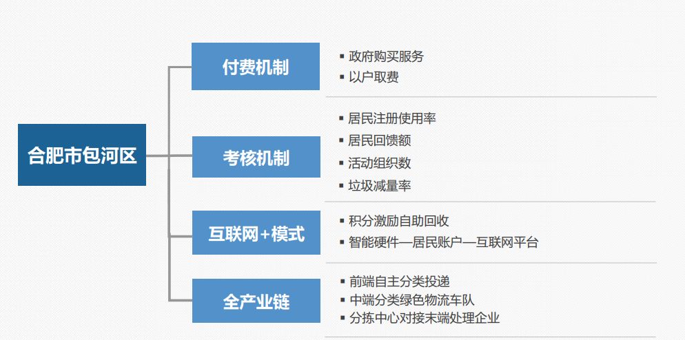 目前北京的16個(gè)區(qū)中我們已經(jīng)在8個(gè)區(qū)中開展了工作,除此之外,2017年1月,中標(biāo)合肥市包河區(qū)生活垃圾分類項(xiàng)目,該項(xiàng)目主要服務(wù)包河區(qū)10萬戶的居民垃圾分類服務(wù)工作。付費(fèi)機(jī)制是政府購買服務(wù),按戶進(jìn)行收費(fèi),每戶280塊錢。還有一套考核機(jī)制,根據(jù)居民注冊(cè)使用率、居民回饋額、活動(dòng)組織數(shù)、垃圾減量率進(jìn)行考核與反饋。