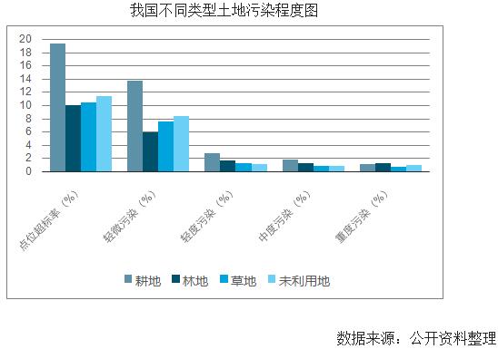 從土地類型來(lái)看,耕地的點(diǎn)位超標(biāo)率最高,達(dá)到了19.4%,而其他三種土地的超標(biāo)率略高于10%的水平。耕地直接涉及到我國(guó)的食品安全問(wèn)題,這也是近年來(lái)土地污染問(wèn)題越來(lái)越受到群眾關(guān)心的重要原因。