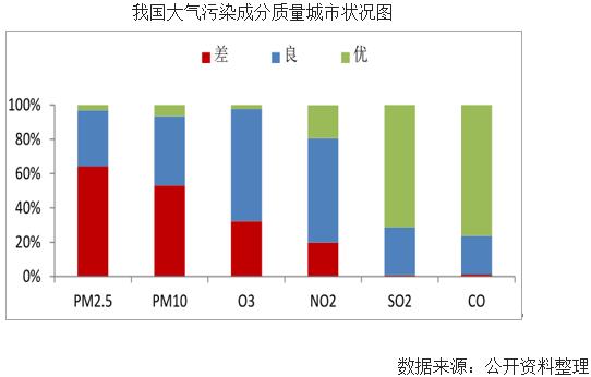 我國(guó)大氣污染源主要集中于工業(yè)污染和汽車尾氣,根據(jù)環(huán)境部發(fā)布的《2017年中國(guó)環(huán)境狀況公報(bào)》,我國(guó)338個(gè)城市中大氣的主要污染物集中在PM2.5、PM10、臭氧和氮氧化物。其中較為嚴(yán)重的是PM2.5和PM10。在統(tǒng)計(jì)的338個(gè)城市里,這兩項(xiàng)指標(biāo)差的城市比例高達(dá)50%以上。改善空氣質(zhì)量要從上述4種物質(zhì)的排放源下手。