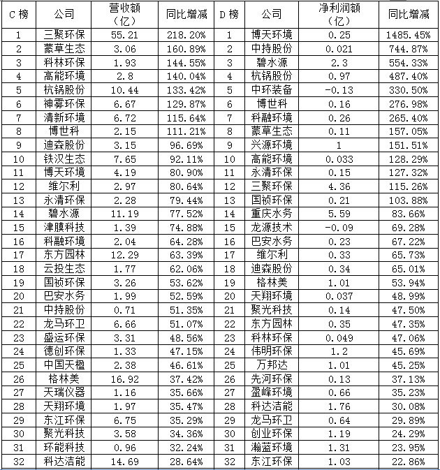 2017年多數(shù)環(huán)保上市企業(yè)一季度報(bào)告顯示贏得開(kāi)門(mén)紅,同期均有所增長(zhǎng),僅四家表示營(yíng)業(yè)收入同期下降。不過(guò)凈利潤(rùn)7家為虧損狀態(tài), 15家同期下降。以下A榜為營(yíng)業(yè)收入排行榜,B榜為凈利潤(rùn)排行榜。C榜為營(yíng)業(yè)收入同比增長(zhǎng)率排行榜,D榜為凈利潤(rùn)同比增長(zhǎng)率排行榜。