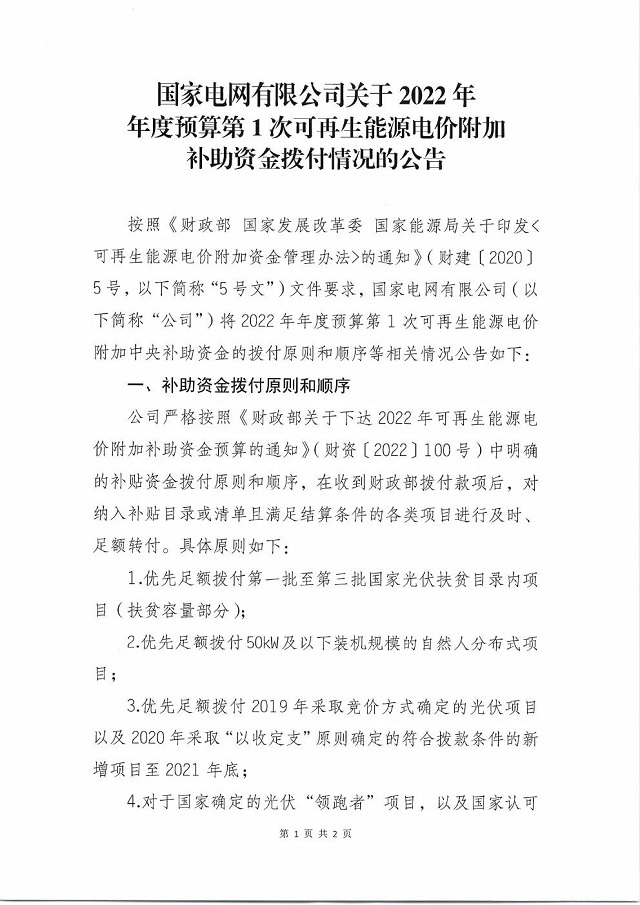 2022年7月15日,國(guó)家電網(wǎng)微信平臺(tái)發(fā)布“關(guān)于2022年年度預(yù)算第1次可再生能源電價(jià)附加補(bǔ)助資金撥付情況的公告”,提到將對(duì)納入補(bǔ)貼或清單且滿足結(jié)算條件的各類項(xiàng)目進(jìn)行及時(shí)、足額轉(zhuǎn)付。 具體來(lái)看,2022年年度預(yù)算第1次請(qǐng)款,財(cái)政部共預(yù)計(jì)撥付國(guó)家電網(wǎng)可再生能源電價(jià)附加補(bǔ)助資金年...