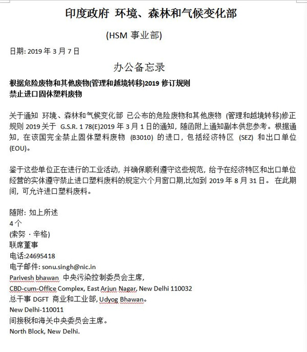 3月13日,本網(wǎng)報(bào)道了《印度宣布將全面禁止進(jìn)口固體塑料廢物》?!敖沼《拳h(huán)境、森林和氣候變化部發(fā)布一份官方聲明,稱印度政府已發(fā)布禁令,禁止印度(包括經(jīng)濟(jì)特區(qū)和出口型企業(yè))進(jìn)口固體塑料廢棄物。不過(guò)該聲明尚未透露這一禁令何時(shí)正式生效?!庇《日?環(huán)境、森林和氣候變化部(HSM事業(yè)部)日期:2019年3月...