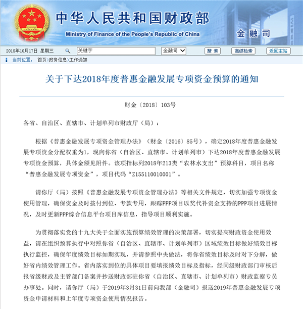 近日,根據(jù)《普惠金融發(fā)展專項資金管理辦法》(財金〔2016〕85號),確定2018年度普惠金融發(fā)展專項資金分配權(quán)重為1,向各省、自治區(qū)、直轄市、計劃單列市財政廳(局)下達(dá)2018年度普惠金融發(fā)展專項資金預(yù)算的通知,隨文公布了獲得以獎代補(bǔ)資金項目名單,并在財政部網(wǎng)站上予以公布。與陜西省環(huán)保集團(tuán)合作的陜...