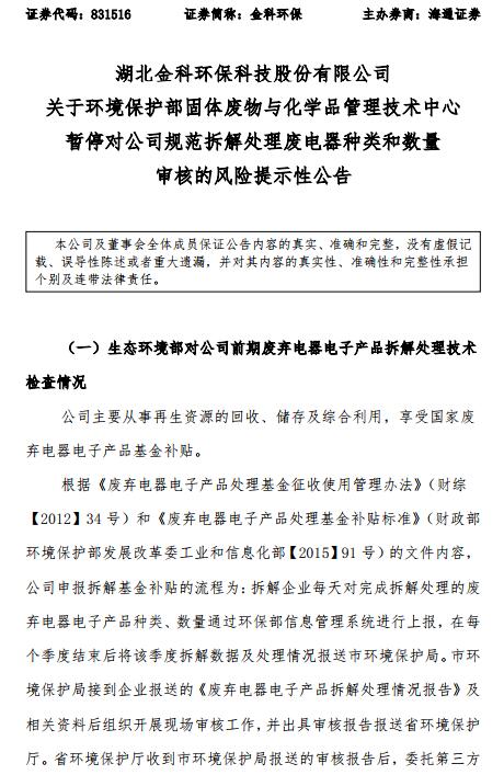 10月17日,發(fā)布公告稱,公司主營業(yè)務(wù)業(yè)務(wù)因未通過2018 年第二批次拆解處理技術(shù)復(fù)核,已暫停工作,該業(yè)務(wù)營收約占公司主營業(yè)務(wù)營收的70%,預(yù)計(jì)將對(duì)金科環(huán)保的經(jīng)營情況產(chǎn)生較大的不利影響。公告顯示,金科環(huán)保廢舊電器拆解業(yè)務(wù)未通過審核的原因在于:1、存在集中大規(guī)模拆解疑似拼裝、仿制液晶類廢電器并申領(lǐng)基金...