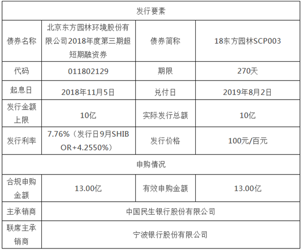 11月5日東方園林發(fā)布了《東方園林超短期融資券發(fā)行情況公告》,具體內(nèi)容如下:北京東方園林環(huán)境股份有限公司超短期融資券發(fā)行情況公告證券代碼:002310股票簡稱:東方園林公告編號(hào):2018-163本公司及董事會(huì)全體成員保證信息披露的內(nèi)容真實(shí)、準(zhǔn)確、完整,沒有虛假記載、誤導(dǎo)性陳述或重大遺漏。北京東方園林...