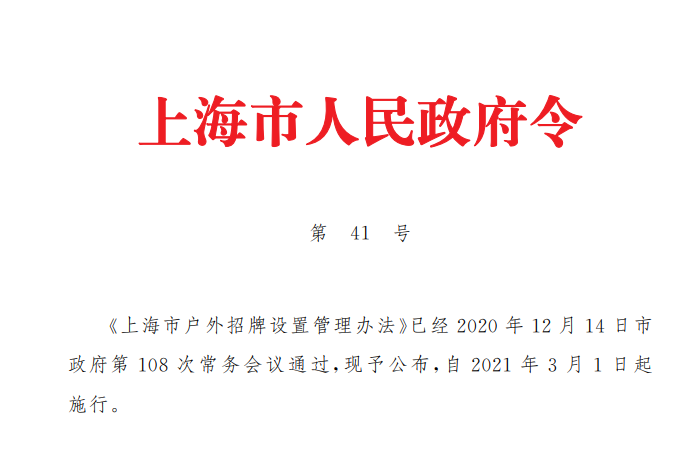 文章導(dǎo)讀戶外招牌是城市公共空間的重要組成部分,直接關(guān)系到城市安全和城市形象。安全規(guī)范、賞心美觀的戶外招牌,展現(xiàn)的是上海的文化內(nèi)涵,傳播的是上海的城市文明?!渡虾J袘敉庹信圃O(shè)置管理辦法》(市政府41號(hào)令發(fā)布,以下簡(jiǎn)稱《辦法》)將于2021年3月1日起施行。希望通過《辦法》,將主體責(zé)任、監(jiān)管責(zé)任與自治共...