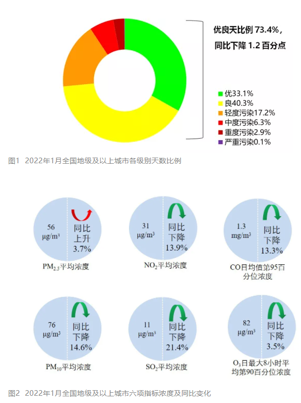 生態(tài)環(huán)境部今日向媒體通報了2022年1月全國環(huán)境空氣質(zhì)量狀況。 總體情況 1月,全國339個地級及以上城市平均空氣質(zhì)量優(yōu)良天數(shù)比例為73.4%,同比下降1.2個百分點;PM2.5平均濃度為56微克/立方米,同比上升3.7%;PM10平均濃度為76微克/立方米,同比下降14.6%;O3平均濃度為82微...