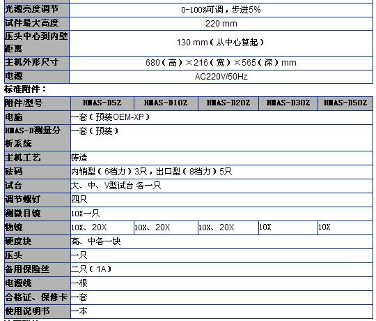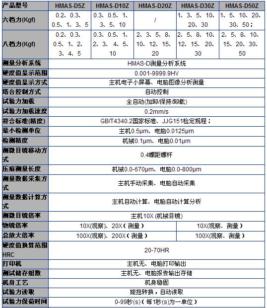 HMAS-D5Z/10Z/20Z/30Z/50Z維氏硬度測量分析系統(tǒng)是本公司推出的第六代光機電一體化的高新技術(shù)產(chǎn)品,該機器造型新穎,具有良好的可靠性,可操作性和直觀性,是采用精密機械技術(shù)、光電技術(shù)、圖形圖像處理技術(shù)和材料硬度分析軟件的新型維氏和努普硬度測試儀器。 性能特點 1、外觀新穎,采用微機控制自動轉(zhuǎn)塔通過軟件執(zhí)行操作,進一步實現(xiàn)測量的智能化。 2、設(shè)備擯棄傳統(tǒng)繁瑣測量步驟,測量方法更簡便 3、設(shè)備自帶打印功能,可將相關(guān)測量參數(shù)打印并保存 4、設(shè)備能對被測材料進行拍攝并能對其組織進行分析和讀取 5、可調(diào)節(jié)測量光源強弱,可預(yù)置試驗力保持時間、并能切換維氏和努氏試驗方法 適用范圍: 熱處理、碳化、淬火硬化層,表面覆層,鋼,有色金屬和微小及薄形零件等.配備努氏壓頭后能測定玻璃、陶瓷、瑪瑙、人造寶石等較脆而又硬材料的努氏硬度. 技術(shù)參數(shù):
